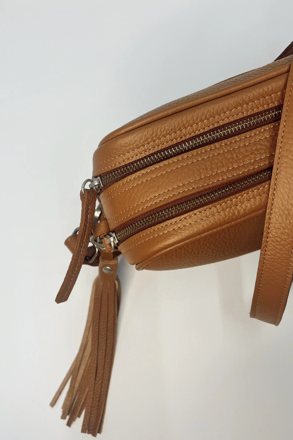 El interior está completamente forrado y posee una correa desmontable y regulable para adaptarse a tu comodidad. Incluye un llavero con flecos que suma un detalle exclusivo.