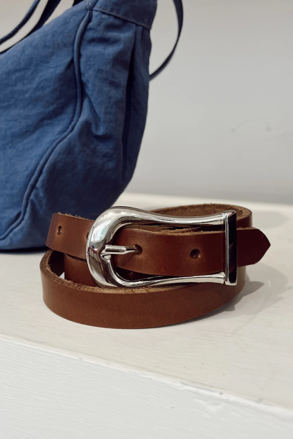 Cinturón realizado en cuero con hebilla metálica plateada.
