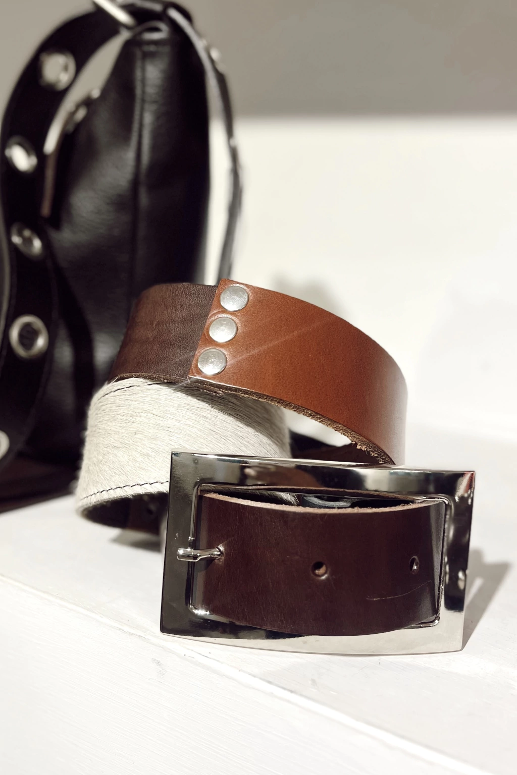 Cinturón realizado en cuero con hebilla metálica plateada.